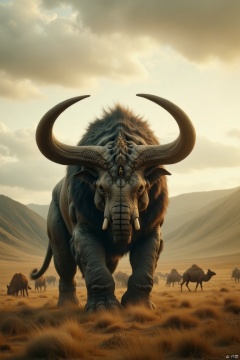 cinematic still . emotional, harmonious, vignette, highly detailed, high budget, bokeh, cinemascope, moody, epic, gorgeous, film grain, grainy, A photograph depicts a mystical creature standing on the grass, resembling an intermediate hybrid of elephants and yak. The creature has strong, textured skin covering its body, with upward-bending antlers on its head. Its head is adorned with a mane of hair, embedded deep in a rugged skull. The animal's eyes are deeply embedded into a jagged bone structure, while its face bears a lion-like appearance. The background features rolling hills and grazing animals like camels or similar creatures. The sky is mostly overcast, with gentle sunlight casting warm, golden light upon the scene, creating a tranquil and majestic atmosphere..guaishou.