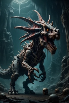 cinematic still A detailed and fantastical creature, resembling dinosaurs but with a clearly supernatural and decayed appearance. This creature has a bizarre design with a large head adorned with multiple corners. Its eyes are orange, giving it an eerie feeling. The body is a blend of organic and mechanical elements, with exposed bones and textured flesh already decaying. This creature stands in a dark cavern environment, with towering rock formations and hanging ice columns on the ceiling. On the ground, there are human skulls and bones scattered, suggesting a future or ancient battlefield atmosphere. The overall atmosphere is dark and ominous, with dim lighting and a sense of foreboding. . emotional, harmonious, vignette, highly detailed, high budget, bokeh, cinemascope, moody, epic, gorgeous, film grain, grainy.guaishou.