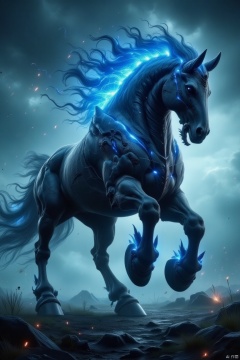 cinematic still This photo depicts a mythical and magical creature, resembling a dark armored horse. This horse is mostly black, with blue light emanating from its fur, especially on the mane and tail. The mane and tail are rotating and dynamic, giving it an energetic appearance. The horse's body is decorated with complex mechanical armor that highlights this feature. The blue light highlights this aspect of the armor. The background features a dramatic and stormy sky, with clouds covering the area, scattered sparks or ashes, suggesting a battle or a mysterious event. The ground appears uneven, featuring rocks and small plants. The overall atmosphere is strongly mysterious and powerful, and the horse seems to be propelled forward with immense force and energy. . emotional, harmonious, vignette, highly detailed, high budget, bokeh, cinemascope, moody, epic, gorgeous, film grain, grainy,guaishou.