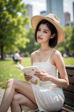 An elegant woman in a white dress and straw hat sits on a bench in Central Park, reading. Annie Leibovitz-style portrait art, she tilts her head slightly, sunlight filtering through leaves illuminates her figure. Background: blurred greenery and distant city skyline. Shot on Canon EOS R5 with 85mm lens, shallow depth of field highlights the subject, post-production enhances light and shadow layers, emphasizing her grace and tranquility.