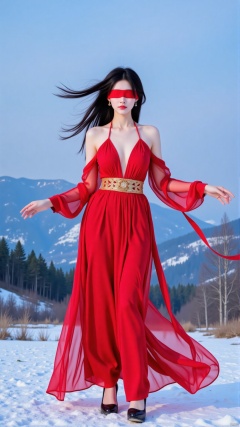 he image shows a young woman standing on a snowy mountain landscape. She is wearing a long, flowing red dress with a gold belt and black high heels. The dress has a deep V-neckline and long sleeves. The woman has long dark hair that is flowing in the wind and is covering her eyes with a red blindfold. Her arms are stretched out to the sides and her legs are slightly bent at the knees. The background shows a beautiful view of the mountains and trees. The sky is blue and the overall mood of the image is dreamy and ethereal.
