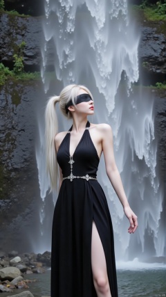 The image shows a young woman standing in front of a waterfall. She is wearing a black halter-neck dress with a high slit on the side. Her long white hair is styled in a half-up, half-down ponytail. She has a black blindfold covering her eyes. The waterfall cascades down a rocky cliff in the background, and the water is flowing over the rocks. The woman is looking up at the waterfall with a peaceful expression on her face. The overall mood of the image is serene and serene.