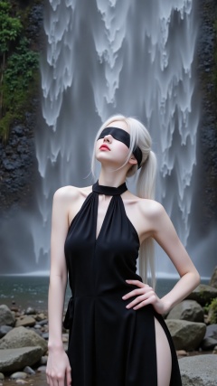 The image shows a young woman standing in front of a waterfall. She is wearing a black halter-neck dress with a high slit on the side. Her long white hair is styled in a half-up, half-down ponytail. She has a black blindfold covering her eyes. The waterfall cascades down a rocky cliff in the background, and the water is flowing over the rocks. The woman is looking up at the waterfall with a peaceful expression on her face. The overall mood of the image is serene and serene.