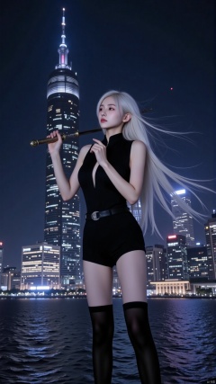 The image shows a young woman standing in front of a city skyline at night. She is wearing a black bodysuit with a plunging neckline and thigh-high stockings. She has long white hair that is flowing in the wind and is holding a sword in her right hand. The woman is standing on a concrete platform with a body of water in the background. The city skyline is lit up with colorful lights and there is a tall skyscraper in the distance. The sky is dark and the overall mood of the image is dramatic and mysterious.