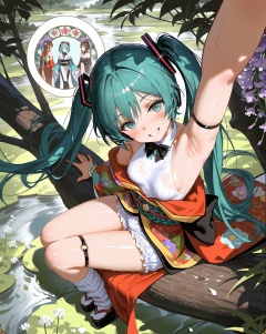 (ibara dance:1.3),(wlop:1.2),bukurote,dk senie,alchemaniac,liduke,fuzichoco,nyalia,,masterpiece,highres,absurdres,uncensored,NSFW,rating explicit,best quality,year 2024,newest,(art nouveau:1.4), hatsune miku,white bracelet,kneehighs,ribbed legwear,loose socks,fishnet leggings,mismatched legwear socks,footwear ribbon,wedge platform footwear,gladiator sandals,black bowtie,(multicolored kimono:1.2),layered kimono,lightcyan pelvic curtain,detached sleeves,armlet,furisode,(bloomers:1.2),jewelry,chains,blue eyeshadow,garter straps,o-ring thigh strap,o-ring,oiled up skin, blush,:d,grin,armpits,(head tilt:1.1),reaching,skirt pull,sitting in tree,legs together, presenting armpit,sweaty armpits,(grove:1.3),stream,(outdoors:1.2),(spider lily:1.2),orchid,wisteria,tree,(looking at viewer:1.2),(from above:1.1),from behind,cinematic angle,Show less