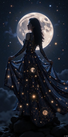 Astrology Oracle Silhouette: Create a mystical silhouette incorporating zodiac elements. The womans form should be adorned with astrological symbols,with her dress flowing into a star chart. Her hair could be a swirl of zodiac constellations. Within the silhouette,include subtle images of planetary bodies and astrological houses. The background should be a deep night sky with a prominent moon phase. Add tarot card imagery or mystical runes floating around her to enhance the divinatory atmosphere.,