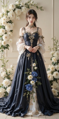 a medium-sized portrait of a woman in a black and white dress adorned with gold embroidery stands in front of a backdrop of white roses. The woman's dress is adorned with a long flowing blue skirt adorned with blue and white flowers adding a touch of color to the scene. The backdrop is a cream-colored wall adorned with white roses adding depth to the composition.,