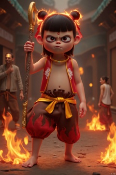 A fantasy masterpiece: 'Nazar's Fury'. A 6-year-old shota, Nazaha, stands defiantly, his black hair ablaze with fiery locks. His red eyes glow like embers as he pouts his lips in disdain. He holds a polearm, its metal shaft gleaming in the vibrant colors of the scene. His upper body is bare, while his lower half is clad in red shorts and bound by a crimson ribbon. The ground beneath him crackles with fireballs, each foot stepped on one as he stands firm. In the background, a man continues to smile serenely, amidst the fiery chaos. Perfectly framed, this 8K wallpaper masterpiece is a symphony of colors, composition, and lighting, a true work of art.