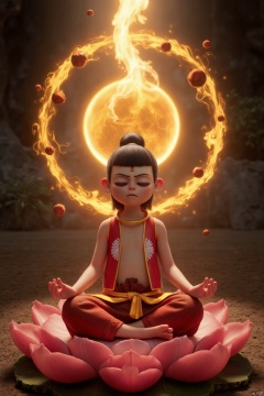 A serene and majestic scene: Nezha sits cross-legged on a massive lotus flower, his eyes shut in deep contemplation. A halo of golden light radiates from his body, illuminating the surrounding air where various magical artifacts float. His face exudes a sense of focused determination as he practices his spiritual exercises, his very being infused with an aura of inner peace and enlightenment.