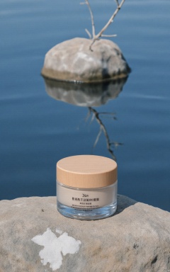 A light brown jar of skin care cream with a wood texture lid,front view,with a high-end feel,high resolution,clear details,natural lighting,and in the style of high quality photography. The overall color tone creates an elegant atmosphere. It uses glass material for packaging to highlight luxury and elegance,in the style of high-end photography. In the center of an endless lake,the moon is reflected in the water,and there is an stone. A dead branch sticks out from under it. Dewdrops hanging on the branches,a scene of cold dew.The moon shines on everything,creating beautiful reflections on the water surface .Slight reflection of water waves. The scene features an ethereal misty blue background and subtle reflections of light.It's **** being lost between dreams and reality. Photorealistic in the style of Chinese wind,