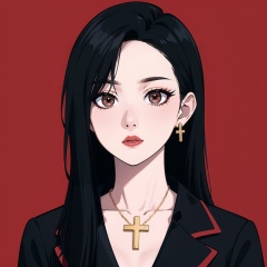 looking at viewer,expressionless,(upper body),1girl,solo,loli,pale_skin,bangs,long hair,(black hair:1.3),(brown eyes:1.2),red lips,eyeshadow,makeup,((closed mouth:1.2)),cross necklace,(black jacket),(cross earrings:1.3),red background,<lora:beauty:0.85>,