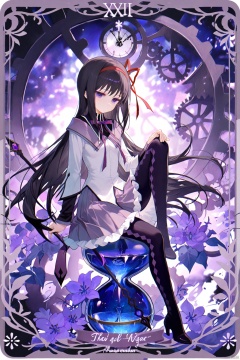 akemi homura, 1girl, long hair, tarot, gears, black hair, tarot (medium), ribbon, solo, purple eyes, roman numeral, sitting, argyle legwear, skirt, pantyhose, argyle clothes, long sleeves, jacket, purple skirt, red ribbon, knee up, character name, flower, hairband, black pantyhose, white jacket, hand on own knee, full body, purple theme, magical girl, hair ribbon, card (medium), very long hair, neck ribbon, purple ribbon, purple flower, holding, closed mouth, soul gem, weapon, clock, boots, purple bowtie, frilled skirt, shirt, pleated skirt, halo, border, hourglass, bowtie, expressionless, staff, black footwear,