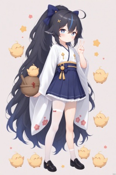 tsubasachyan,cxnice3,lolisugerjio,ku(azurelane),masterpiece,best quality,high quality,loli, 1girl, solo, hair wings,long hair, blush, bangs, blue eyes,symbol-shaped pupils,cross-shaped pupils,black hair, hair ornament, hair between eyes, very long hair, streaked hair,  blue hair, hair bow, standing, full body,  pantyhose, multicolored hair,  shoes,  tall ponytail,  white pantyhose, simple background,V,single thighhigh,two-tone hair, ahoge,