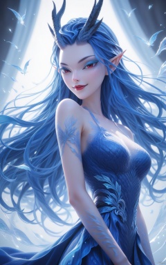 score_9, score_8_up, score_7_up,highly detailed digital,CG,1girl, solo, long hair, breasts, smile, red eyes, dress, bare shoulders, medium breasts, blue hair, upper body, horns, pointy ears, makeup, blue dress, eyeshadow, red lips