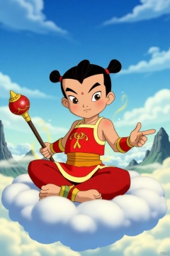 In this shot, a boy dressed as Nezha is captured from a low angle. He has a round face with bright eyes and short black hair. His Chinese clothes are red and gold, with intricate patterns. He is sitting cross-legged on a cloud, holding a magical weapon. The background is a mystical sky with floating mountains, and the composition includes his full body.