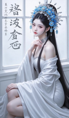 1girl, solo, long hair, looking at viewer, black hair, hair ornament, long sleeves, dress, bare shoulders, jewelry, sitting, flower, earrings, choker, indoors, hair flower, wide sleeves, off shoulder, white dress, lips, window, makeup, chinese clothes, blue flower, chinese text, red lips