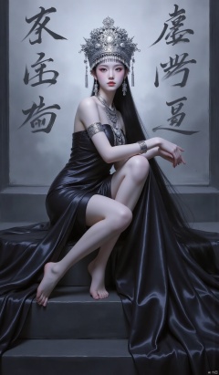 1girl, chinese ethnic minority costumes, long hair, looking at viewer, bangs, black hair, dress, bare shoulders, jewelry, sitting, very long hair, earrings, barefoot, necklace, black dress, bracelet, lips, bare legs, own hands together, armlet, stairs, realistic, red lips