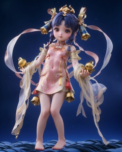 air_skin,white_skin,score_9,<lora:SF_CaiWenJiSheNian_Pony_Realism-000004:0.7>,dress,hair ornament,bangs,blue hair,braid,shawl,necklace,chinese clothes,1girl,minigirl,breasts,medium breasts,hagoromo,bell,solo,barefoot,looking at viewer,simple background,full body,ribbon,