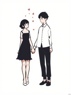 JYXT, A minimalist sketch of a couple, the woman in a black dress with white lace sleeves and white ballet flats, the man in a white dress shirt and black dress shoes, holding hands and gazing at each other adoringly, with heart-shaped confetti falling from above.