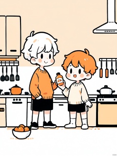 JYXT, A cute, simplistic, digital drawing of two young boys in a kitchen. The boy on the left has short white hair and is wearing a white shirt and white shorts. He is holding a bottle of orange sauce. The boy on the right has black hair and is wearing a beige sweater, black shorts, and white socks. He is holding a large white bowl. The kitchen has light-colored cabinets and a stove with a pot on it. The background is white. The drawing style is minimalistic and cartoony, with simple shapes and soft colors.