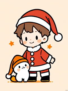 JYXT, A cute, chibi-style drawing of a young boy wearing a red and white Santa hat and a matching red coat with white trim. He has short brown hair and is smiling warmly. The boy is holding a small, white, cat-like creature with orange accents on its ears and tail. The background is plain white, and the overall style is simple and whimsical with bold outlines and minimal shading.