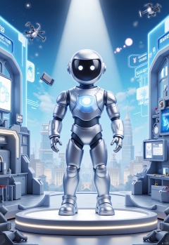 YYHB, A sleek 3D representation of a stylish, silver robot with holographic screens and a sleek design, presenting a sleek product on its chest. The robot stands on a futuristic, glass-walled stage amidst a backdrop of shimmering lights and digital projections. The backdrop is a futuristic, high-tech cityscape, with towering skyscrapers and hovering drones. The scene is sleek and sophisticated, with a cyberpunk, futuristic aesthetic.