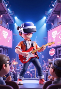 YYHB, A vivid 3D illustration of a musician wearing augmented reality glasses, performing in a virtual concert hall. He holds a holographic guitar, strumming along to a catchy tune. The concert hall is illuminated by stage lights and filled with virtual audience members. The background includes a virtual band and a wall painted with a mural of musical instruments. The musician is dressed in a flashy, stage-ready outfit and stylish boots. The overall aesthetic is lively and energetic, with a focus on music and performance.