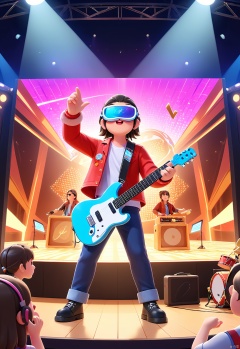 YYHB, A vivid 3D illustration of a musician wearing augmented reality glasses, performing in a virtual concert hall. He holds a holographic guitar, strumming along to a catchy tune. The concert hall is illuminated by stage lights and filled with virtual audience members. The background includes a virtual band and a wall painted with a mural of musical instruments. The musician is dressed in a flashy, stage-ready outfit and stylish boots. The overall aesthetic is lively and energetic, with a focus on music and performance.