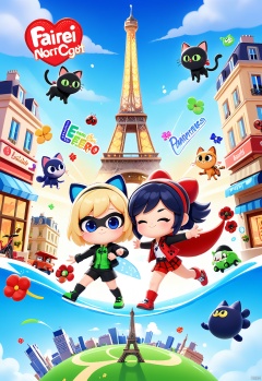YYHB,A bright and colorful digital artwork features characters from "Miraculous: Tales of Ladybug & Cat Noir," set in a vibrant Parisian cityscape with the Eiffel Tower in the background,illustrating Marinette,Adrien,and Tikki in delightful chibi styles,saving the city,exuding heroism and excitement.,