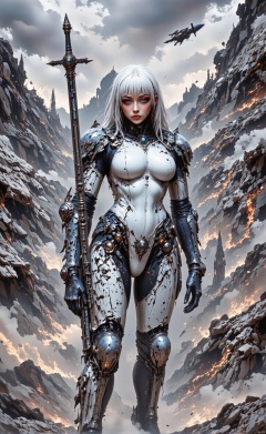 bo-an1me, dark fantasy illustration, high detail fantasy anime, a striking figure standing confidently amidst a desolate, futuristic landscape. The character is adorned in a sleek, intricate suit of armor that seamlessly integrates mechanical components, giving them a formidable and otherworldly appearance. Their long, flowing white hair is styled elegantly, and their piercing blue eyes exude a sense of determination and strength. The character wields a large, ornate sword, which is held firmly in their right hand, ready for action. The armor is complemented by delicate, silver accents that add a touch of sophistication to their otherwise formidable presence. The background is a chaotic, post-apocalyptic scene with debris and a faint, misty atmosphere, enhancing the sense of a world in turmoil. The lighting is dramatic, with a soft glow illuminating the character's form and casting subtle shadows that emphasize their muscular structure and the intricate details of their armor. The overall effect is one of a powerful, ethereal figure standing against a backdrop of destruction, embodying both resilience and grace.,BO-AN1ME,
