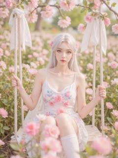 A young woman in a place where she is in the blooming scenery of flowers. She has long, soft hair, bright flowers on her hair, and is wearing a white dress with floral embroidery, and the overall look is fresh and sweet. She held a rope wrapped around pink flowers, which seemed to be on a swing adorned with white curtains. Flowers of various colors bloom around, including pink, purple, etc., with green backgrounds and sunlight shining through the branches and leaves, creating a romantic and warm atmosphere. This style is common in the creation of illustrations with beautiful and romantic themes, showing the beautiful fusion of nature and youth. ,zichu