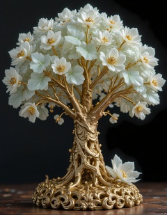 JXY, Capturing the essence of luxury and nature, a photograph of an ornate tree sculpture made of a combination of gold and jade. The trunk features intricate carvings and a realistic, textured design, while the canopy is a dense mass of vibrant jade leaves and pristine white flowers, each with golden stamens that add a touch of elegance. The background is a solid black, providing a stark yet sophisticated backdrop that highlights the tree's exquisite craftsmanship. The sculpture embodies the perfect blend of opulence and natural beauty, ideal for a high-end home decor setting or as a centerpiece of art.