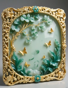 JXY, A meticulously crafted golden frame, enriched with intricate jade designs and boasting a high-gloss finish, encases a stunning jade relief. The relief depicts a lush garden scene, with blooming flowers, verdant vines, and fluttering butterflies. The details are intricate, with swirling lines that give a sense of life and movement. The jade is smooth and translucent, with a gentle, inner glow. The frame's design is inspired by nature, with flowing curves and a luxurious, organic feel. The overall aesthetic is serene and elegant, perfect for a tranquil setting.