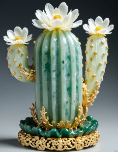 JXY, A photograph of an exquisite, ornate jade cactus sculpture resting on a gold-inlaid base, adorned with pristine white and creamy yellow flowers. The cactus stands tall and columnar, boasting a smooth, emerald-green surface that glimmers with a subtle luster. The flowers, lifelike and abundant, are strategically placed atop and around the cactus, some boasting golden yellow centers that add a touch of warmth. The gold base features intricate, floral designs and a delicate scalloped edge, enhancing the sculpture's sophistication. The background is a plain, deep black, allowing the jade cactus and its golden accents to shine in isolation.