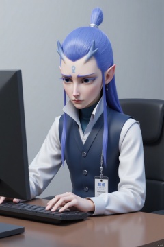 solo, long hair, looking at viewer, blue eyes, simple background, 1boy, blue hair, upper body, ponytail, male focus, horns, pointy ears, makeup, facial mark, portrait, eyeshadow, forehead mark, hair pulled back,mmgaobing,mmgaobing,sitting at a computer desk,is typing on the keyboard,looking seriously focused on work,wearing a shirt and a vest,and carrying an ID card. The scene is set in an office.,