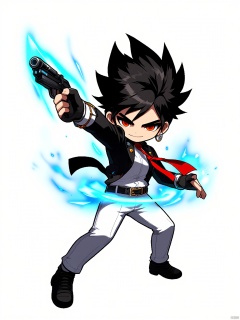 QBJS, A chibi illustration of a character from "Persona 5." The character is a stylish young man with spiky, black hair and striking heterochromic eyes. He wears a sleek black jacket with silver trim, a red tie, and white pants. In his right hand, he holds a glowing blue gun, while his left hand is raised in a confident stance. The background is plain white, highlighting the digital artwork's dynamic pose and vibrant colors.
