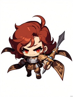 QBJS, Chibi-style illustration of a young warrior princess with curly, auburn hair and fiery red eyes. She wears a breastplate made of scales, matching gauntlets and greaves, a flowing skirt in shades of brown and gold, and wields a spear with an ornate head. The background is plain white, setting off her regal bearing and the intricate craftsmanship of her armor.