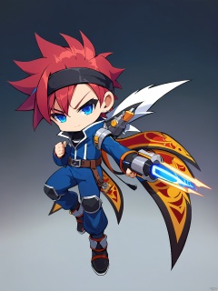QBJS, A digital illustration of a chibi-style anime boy with spiky, crimson hair and a black headband. He sports a determined look and wears a sleek, silver and blue jumpsuit with matching boots. In his right hand, he holds a compact, high-tech blaster, while his left hand rests confidently on his hip. The background is a pristine white, allowing the vibrant colors and intricate details of his outfit and weapon to shine.