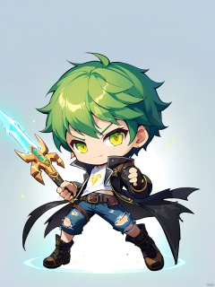 QBJS, A digital illustration of a chibi anime boy with short, spiky green hair and glowing, gold eyes. He wears a black leather jacket over a white t-shirt, paired with ripped jeans and combat boots. His right hand grasps a large, sword-like energy blade, while his left hand is raised in a defensive stance. The background is a clean white, highlighting the sharp lines and bold colors of his outfit and weapon.