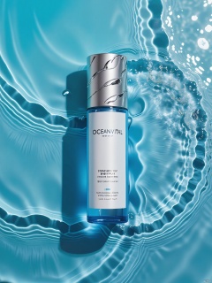 SZCJ,A bottle of OCEANVITAL marine collagen serum is perched on waters that mirror its own azure hues. The sleek design,with a wave-patterned cap and label in English and Norwegian,underscores its oceanic origins. The water's reflective surface amplifies the bottle's sophisticated design.,