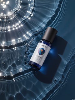SZCJ,A vial of NEBULA elixir rests on a tranquil stretch of water,its glass body refracting light in mesmerizing patterns. The label,with its cosmic design and bilingual text (English and Romanian),evokes a sense of wonder. The water's realistic sheen adds to the vial's enchanting charm.,