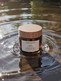SZCJ,A jar of TERRENOVA organic face oil sits on a surface of rippling water,its wooden lid and earthy tones blending with nature. The label,in English and Danish,details the product's natural ingredients. The water's reflections embrace the jar's wholesome essence.,