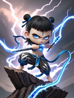 NZ, Digital illustration of a fierce, young warrior woman with an intense gaze. Her short black hair is styled into two high buns adorned with blue ribbons. She wears a blue and silver outfit with a sleek, form-fitting design and black and white lightning-patterned pants. Clutching a long, crystal staff embedded with sapphires, she stands atop a platform of lightning bolts. The background is a swirling, electric gradient, enhancing the sense of power and urgency. The art style is intricate and energetic, with a sci-fi fantasy theme.