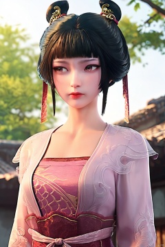 score_9,score_8_up,score_7_up,ZhiGui,1girl, solo, bangs, black hair, hair ornament, long sleeves, dress, upper body, outdoors, day, blunt bangs, tree, looking to the side, chinese clothes, architecture, hanfu