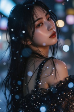 Starlight filter,with white dots dotting the entire image,a Asian young woman with long dark hair wearing a black dress,The unique charm of heterochromia iridum is unforgettable, and the smudged makeup has a kind of unruly beauty. Under the neon lights in the rainy night street, her mocking smile carries a kind of disdainful arrogance, as if mocking the hypocrisy and vanity of this world.