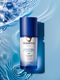 SZCJ,A bottle of OCEANVITAL marine collagen serum is perched on waters that mirror its own azure hues. The sleek design,with a wave-patterned cap and label in English and Norwegian,underscores its oceanic origins. The water's reflective surface amplifies the bottle's sophisticated design.,