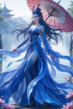 By the Broken Bridge of West Lake, Ao Run was dressed in a long ink wash dress, with dragon horns transformed into lotus stems and scales covered in dewdrops. He held an oil paper umbrella and confronted the Leifeng Pagoda.