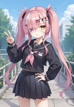 <lora:z47_pony_v1.0:0.7>,z47_\(azur_lane\),twintails, hair_ornament,yellow eyes, pink_hair, eyepatch, pleated skirt,black serafuku, v over eye, school uniform, hand on own hip,outdoors, solo, parted lips,, score_9, score_8_up, score_7_up, source_anime,