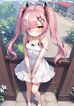 <lora:z47_pony_v1.0:0.7>,z47_\(azur_lane\),twintails, hair_ornament,yellow eyes, pink_hair, eyepatch, sundress, from above, hand between legs,standing, blush,small breasts, looking at viewer, outdoors,,, score_9, score_8_up, score_7_up, source_anime,