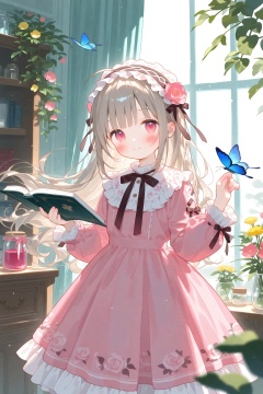 Elite,1girl,bug,butterfly,jar,book,pink dress,dress,frills,frilled dress,window,solo,smile,flower,holding,hairband,looking at viewer,long hair,indoors,red eyes,blush,hair ornament,open book,shelf,butterfly on hand,holding book,blue butterfly,closed mouth,long sleeves,pink flower,hair flower,frilled hairband,bow,plant,collared dress,ribbon,lolita hairband,lolita fashion,floral print,bookshelf,dress bow,puffy long sleeves,grey hair,frilled collar,blunt bangs,blurry,frilled sleeves,bowtie,standing,fruit,neck ribbon,pink ribbon,black bow,cover,food,light brown hair,wavy hair,ahoge,headdress,day,blurry foreground,puffy sleeves,brown hair,very long hair,black ribbon,collar,pink bow,dot nose,depth of field,dated,potted plant,sunlight,leaf,sweet lolita,yellow butterfly,sleeve cuffs,light blush,cover page,bottle,cowboy shot,black bowtie,animal,maid headdress,sidelocks,book stack,pink theme,pink rose,white collar,looking at animal,hair ribbon,jewelry,cabinet,petticoat,feet out of frame,medium dress,frilled shirt collar,rose print,print dress,red bow,black hairband,red ribbon,long dress,buttons,hair bow,hands up,red flower,split mouth,bookmark,hand up,hanging plant,backlighting,brown bow,eyelashes,pink eyes,blurry background,light smile,curly hair,layered dress,sleeve bow,artist name,yellow flower,purple flower,ribbon-trimmed dress,floating hair,looking at object,flower (symbol),white butterfly,light particles,pink sleeves,lace trim,purple butterfly,curtains,bonnet,pink nails,drawer,brown ribbon,jam,headband,transparent,